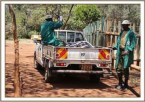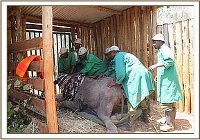 Back at the Nursery she was taken off the drip and helped up. Amazingly she had now mustered the strength to get to her feet. She immediately drank milk and charged the keepers who were quick to make a hasty exit from her stockade in order to give her some space. She started to feed on the fresh cut greens that were in place and continued to feed throughout the night with fresh vegetation being brought to her in abundance.
