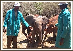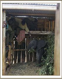 All this, however, was not immediately obvious upon arrival in the Nairobi Nursery, where she was given the usual prophylactic antibiotic injection before being unbound in the 'Taming Stockade'. Understandably, the newcomer was extremely traumatised and very wild, refusing to take milk or rehydration, and simply bent on trying to 'nail' her attendants at every opportunity.