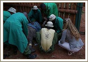 He finally arrived at 6.00pm at the Nairobi Nursery and his wounds were cleaned and treated, packed with green clay, and antibiotics administered. While he was still prone the Keepers lifted his head so that he might get the taste of milk. Amazingly he fed well on a bottle of milk, suckling beautifully before being helped to his feet. Once up everybody had to make a hasty retreat over the stockade walls as he charged around clearly extremely confused by events. There were rumbles of communication from the next-door stockades with both Elkerama (recently rescued) and Arruba his immediate neighbors extremely interested in the new arrival. He knew then he was amongst his own kind, which was reassuring for him.