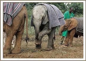 She was originally placed in the stable next to Shimba, but the following day when she met up with the three little orphans already resident at the nursery, Lempaute, Shimba and Lesanju, she became instantly hooked on Lesanju. (We had removed the stable partitions the previous day to accommodate Lempaute and Lesanju in one large stable as they had been moved from their original stable to accommodate the newcomer) Mellow Shimba didnt seem bothered either way, and Lempaute was clearly jealous as Lesanju became fixated by the newcomer. She is such a responsible little elephant Lesanju, and she shares a special bond too with Sinya, as both suffered the same fate, albeit hundreds of miles apart and from two different elephant populations in Kenya, but both fell down man made wells, and both were rescued by caring Maasai and Samburu tribesmen respectively. Sinyas first full day in the nursery began with her being placed in the big stable together with all the little orphans as it was a rainy cold morning. This provided a perfect place for them all the get to know each other, and for us to get to know her. Although mischievous little Lempaute was more interested in playing with whoever would oblige, and occasionally shoved Sinya when she thought nobody was looking. Soon the rain subsided and the rest of the day was spent outside, the little group of babies staying together for the day.