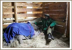 That night Sinya refused to stay in the stable next door to Shimba and was incredibly restless even becoming aggressive towards the Keepers for the first time. At first we thought it may be because of the pain from her recently dressed wounds, but it soon became evident that it was Lesanju she was after. Eventually Sinya was moved into the big stable and once she found herself back with the other two little girls, Lesanju and Lempaute, she instantly calmed down and fell asleep close to them peacefully, three elephant lumps in the hay, and three Keepers. This left Shimba alone with his Keeper with no next door neighbor but he appeared to be completely oblivious to this development, and probably was relieved to have a more peaceful night as a result. With the company of the other elephants close by Sinya each day and night her physiological wounds will heal, it will of course take time, but thanks to those that rescued her and with the love of her dedicated Keepers and the other orphans in the Nursery the memories of her terrible ordeal will fade and she has another chance of life.