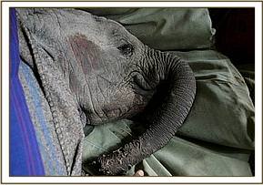 As the dawn broke over Amboseli and Mt. Kilimanjaro, Cynthia Moss and the rest of the Amboseli Elephant Research Team returned to the airstrip to see how everybody had fared overnight. There she found three tired men having had no sleep at all, but Sinya sound asleep. Before the rescue plane arrived the Keepers took their young charge for a walk down the airstrip and she followed them willingly, ravenous for more milk. It was not long before the plane arrived with Robert Carr-Hartley, another Keeper armed with freshly mixed milk, and some breakfast for Stephen, Amos and Josphat, who by this stage were exhausted. Sinya was loaded into the aircraft with the help of KWS personnel and the Amboseli Elephant Research Unit and flown directly to Wilson Airport in Nairobi and once there then had to endure another short journey in the back of the pick up to The David Sheldrick Wildlifes Nairobi Nursery situated in Nairobi National Park.