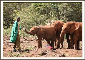 Upon arrival (evening of the 3rd April, 2008), little “Siria”, although weakened, dehydrated, riddled with stomach parasites and by now showing tell-tale signs of emaciation, still had enough reserves to give us all a run-around during his first night at the Nairobi Nursery. However, by the next morning he was hoovering up milk from a bucket, and eating as many greens as we could cut for him, but remained reluctant to drink from the bottle. After two more days in the Stockade with an Attendant Keeper, he was calm enough to handle, and on the 6th April could be let out with the other older Nursery Elephants, having first been de-wormed. Lenana, Makena and Chyulu were ecstatic, all showering him in love, each one wanting to “possess” him, holding him with their trunks, even rounding him up to return him to the mudbath when he tried to escape having been temporarily spooked by all the visitors, and generally affording him such a warm and loving elephant welcome, that immediately he relaxed and began to feel quite at home with his new elephant and human family. He seemed to crave their company and comfort having had some lonely months by his sick mother’s side and no interaction with other elephants. The older orphan elephants have also showed him how to drink his milk from a bottle instead of a bucket..