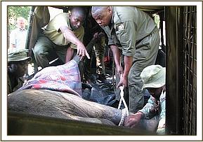 Thereafter, she laboriously moved closer to the Lodge compound where she felt her baby would be safer, for by now he too was losing body condition, and becoming progressively weak, for she was too ill to produce milk for him. There she could be closely monitored by Mr. Dave Richards, the very ele-friendly Manager of Little Governor’s Camp who kept our Vet Unit informed of the elephant’s deteriorating condition. By the beginning of April, she was so obviously in intense pain and unable to move. The other front leg had also become enormously enlarged, and pus was being exuded from the severed trunk. Clearly the elephant was now in an advanced state of septicemia so the Vet was called again to assess her condition and together with the Conservancy authorities make a decision as to whether or not she should be humanely euthanized, and the calf saved. This time, it was patently obvious that there was absolutely no chance whatsoever of recovery and the elephant’s suffering was such that the decision was made to end her misery and rescue the calf, who also faced death without access to milk. The calf was therefore physically captured, which proved easier than anticipated due to his weakened state by just throwing a blanket over his head and restraining him with a few men. He was then tied and transported to the Rescue Plane which had been sent by the Sheldrick Wildlife Trust (with the approval of the Conservancy authorities and the Kenya Wildlife Service,) who understood that as a milk dependent baby of l8 months, it, too, had no chance of survival had it been left in situ, and would have either been torn asunder by hyenas, or left to die a lonely and lingering death from milk deprivation. The vet accompanied the calf on the plane along with the Trust’s Keepers, having administered a tranquilizer to keep Siria calm throughout the flight.