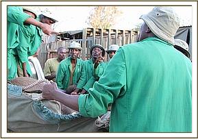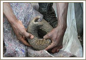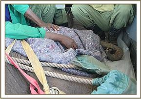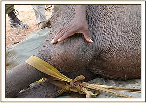 The capture took place on the 11th, the female orphan too weak and lame to put up much resistance. The right hind leg had a huge protrusion on the top joint which appeared to possibly be the result of a previous fracture. Two small scars at the site of swelling indicate that it could be an old arrow or spear wound, leaving the calf walking with a pronounced limp.