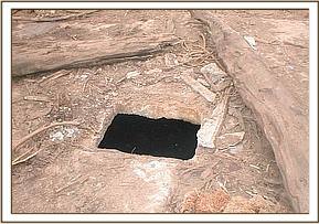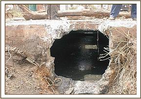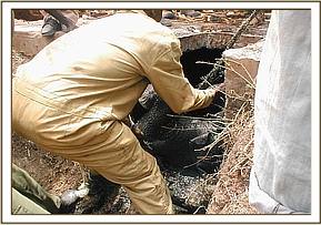 With the help of the hotel staff a hole was hacked through the wall of the septic tank in order to pull the calf out