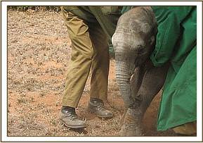 It was fortuitous indeed that the Wildlife Officer at the Sanctuary happens to be an ex KWS employee who had long been conversant with the Trust’s Orphaned Elephant Project. He had already informed the KWS Tsavo East authorities and Joseph Sauni and the Voi Keepers were already on their way to the Sanctuary with milk formula and rehydrants for the calf which was a baby bull estimated to be about 8 to 9 months old, and who had been without milk for about a week. In all likelihood this was the calf of the dead mother found by the Ziwani De-Snaring team.