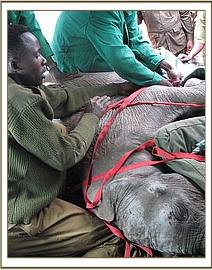 August coincides with the height of the wildebeest migratory spectacle in the Masai Mara, so all Charter Companies that operate out of Wilson Airport are kept busy. The first available plane could only leave Nairobi at 11.30 a.m. landing at Taita Hills Sanctuary at about 1 p.m. Aboard were three Nursery Elephant Keepers, including Edwin Lusichi, who was able to administer the first of the usual course of injectible antibiotic. The calf was then surrounded by the Keepers who steered it to the waiting plane before being laid down on the rescue tarpaulin with bound legs and loaded onto the plane for the flight back. The Trust’s Pickup truck was waiting at Wilson Airport to take the calf back to the Nursery. He arrived there in the late afternoon and was carried recumbent into a stable that had been prepared for him next door to that occupied by Shimba and Dida. Daphne and Angela were in Tsavo at the time, keeping in close touch with Lina Sideras and the Keepers by mobile phone and decided that the new arrival be named “Taveta”, the name of the border town on the Kenya Tanzanian border which is not far from both the Taita Hills Sanctuary and the Southern part of Tsavo West National Park.