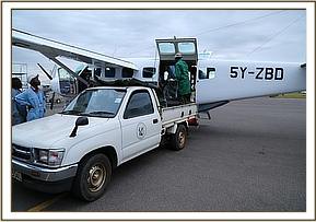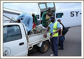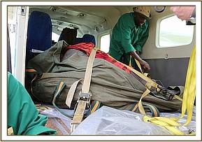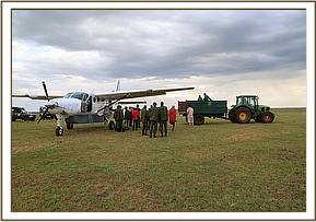 The Mara is in south west Kenya, a forty five minute flight from Nairobi. Richard Pye collected the SWT rescue team and drove them to the site where the scouts were protecting the calf. Showing little hesitation and striding across the plains the experienced SWT Keepers were able to catch up with the calf and restrain the baby quickly and effectively, ably assisted by the Masai Conservancy Scouts who followed close behind incase help was needed. Given the drama from the previous night’s capture which they had performed alone, the Scouts were extremely interested to learn the secret technique behind capturing elephants. It was not long before he was safely loaded into the back of the trailer with two Keepers for company and driven in convoy slowly back to the airfield. Pregnant dark skies threatened rain and by now it was nearing 5.00pm.