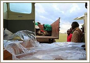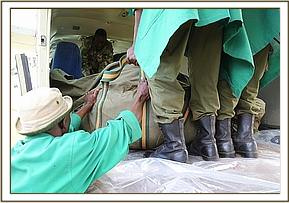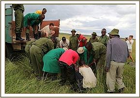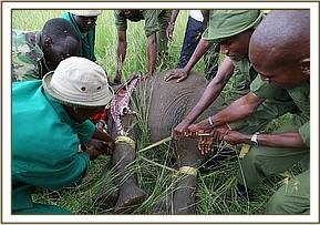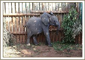 The baby was extremely vulnerable with no sign of elephants in the area so the decision was made to capture him despite the late hour, as they feared for his life should he remain alone overnight. Without the protection of his herd he was small enough to be extremely vulnerable to hyena or a pride of lions. A team supported by Richard Pye captured him at 4.40pm and transported him in the back of a high-sided trailer behind a tractor to the Iseketa headquarters to be kept overnight until the Sheldrick Wildlife Trust rescue team could mobilize a rescue the next morning. The trailer was backed up against a wall and placed under parking shelter as it had begun to rain. The calf was raised to his feet so he would not be recumbent throughout the night. To everyone’s amazement, despite the trailers high sides, the calf managed to clamber out over the side during the night and jump to freedom; in the morning he was nowhere to be seen!
