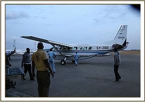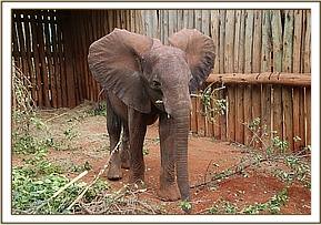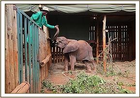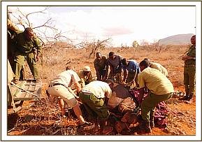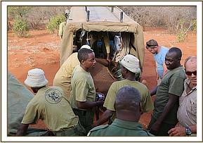 In the meantime, Angela Sheldrick was contacted, and preparations were made to fly the calf to the SWT Nairobi Nursery as it was clear that she would need intensive care given her precarious state. She was a large calf, with tusks one inch long, but severely weakened and emaciated from the drought, so she put up little resistance. The ground team did not have to wait long before the plane landed on the dusty Rukinga airstrip, the calf by now recumbent in the back of a Landcruiser; it required many able-bodied men to heave her out of the vehicle and load her into the aircraft, with both Rukinga staff and scouts all involved in this exercise. She was immediately placed on intravenous lifesaving drip for the duration of the flight and the drive to the Nursery based in Nairobi National Park.