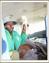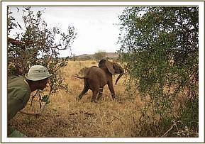 Meanwhile Dr Poghon, the SWT’s Kenya Wildlife Service field veterinarian had mobilised a rescue team from the Voi elephant stockades and located the calf, managing to capture the young and feisty bull and restrain him in order to get him into the vehicle and safely to the Voi airstrip where the rescue plane and the Nairobi team would meet them.