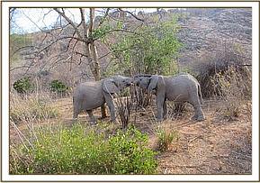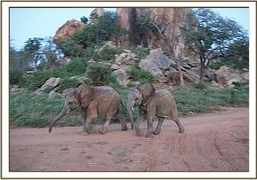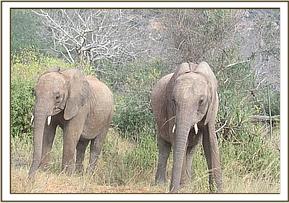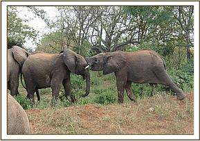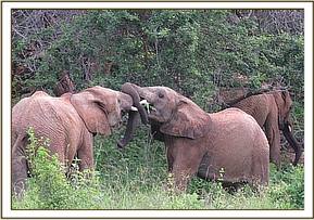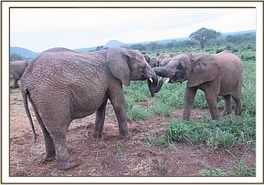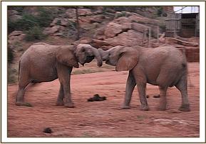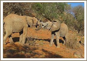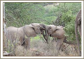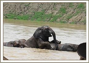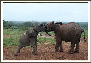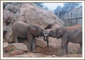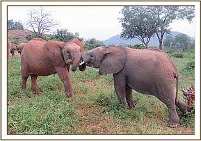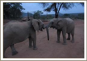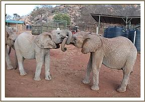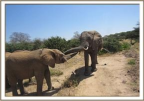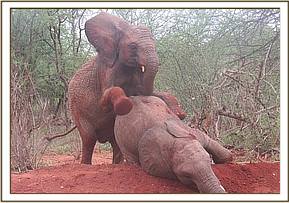 Kainuk resting her trunk on Vuria's back