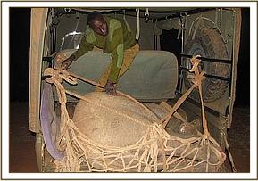 Having landed at Voi our Nairobi Elephant Keepers were driven to the Voi Elephant Stockades, the team was then faced with the problem of having to overpower an extremely wild elephant, who simply wanted to kill every human in sight. This was a challenging prospect and took some doing, it being necessary to avoid sedation, due to the risk of bloat, which, in the past, has cost the life of orphans of that age immobilized for what was to be a long journey. She was, however, given a Stressnil injection, which didn’t seem to have much affect, because the calf gave the Keepers a real run around before she was overpowered, her legs tied, and lain down on the rescue tarpaulin, in order to be driven to the airfield and eventually loaded onto the plane.