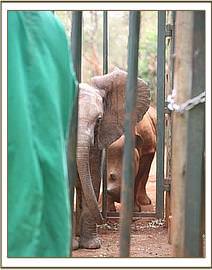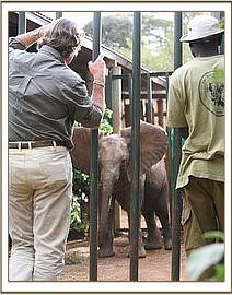 By the next morning she was still unmanageable but would take water and eventually some milk from a bucket. Maxwell was thrilled to have a near neighbour throughout the night, and slept pressed up against his side of the separating poles. Max loves the elephant orphans, for they come to greet him each morning with a trunk-touch on the face! The other elephants were then brought around to see her, but being older and bigger than Lesanju, and therefore a competitor for the babies, Lesanju didn’t linger long, and hurried her little troupe off again as quickly as possible, probably also sensing the aggression of the newcomer!