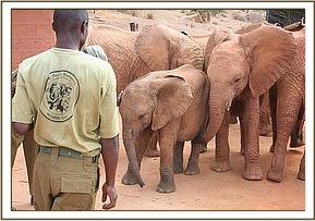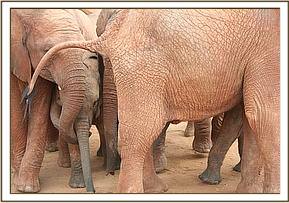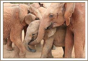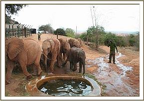 Before 12 noon they were at Voi, with the stockade mudbath prepared for their arrival and their old nursery orphan friends waiting close at hand. They were greeted by the older Voi orphans amid rapturous trumpets and much excitement, and Tassia was immediately singled out as Lempaute’s favorite calf. Lesanju and Lempaute seemed especially delighted to have two little ones to tend to and ensured their first steps in Tsavo East were shadowed by protective ‘Old Hands’. The new babies seemed totally at home in their new environment the moment they arrived, with Taveta even jumping into the water trough completely submerging himself.