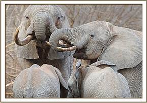 The stories are many and each one wondrous and a perfect illustration of the sophisticated communication of elephants. One surprise was when when a large wild Bull brought orphan Ol malo back home to the Stockades. Ol malo had been absent from Yatta’s group for a couple of days, and since this an unusual event, the Keepers were anxious. Nowadays however it is not uncommon for Ol malo to return on her own having enjoyed wild contact further afield, sometimes in the company of wild elephant friends who are, more often than not, Big Bulls. Her time is spent alternating between them and her Senior orphaned group led by Matriarch Yatta now.