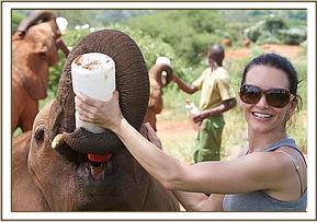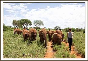 Kristin took time out from her busy schedule and recently visited the David Sheldrick Wildlife Trust orphans’ Project to check on Chaimu, the young elephant calf she had helped rescue from the lava slopes of the Chyulu Hills in June 4th 2009 during the height of the drought that gripped Kenya last year. Kristin has been a great supporter of the work of the David Sheldrick Wildlife Trust ever since that day, and during this recent trip was able to spend time at Ithumba with the Ithumba Orphans unit and Voi with Lesanju’s elephant herd of 11, now ranging from two years old to five years old. With spectacular storms in the area, both Ithumba and Voi have been brought to life by the exceptional rains, every where a profusion of every hue of green imaginable. The orphans seem to celebrate each day with the bountiful food, mud pools and waterholes to frolic in, and all this set against dramatic skies which have made the month of April simply breathtaking in Tsavo this year.