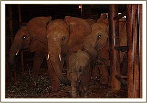 And so, little Lualeni spent the night cosseted by the older group, and was flown to the Nairobi Nursery the following day, arriving at lunch time. She was calm and friendly from the outset, happy to take milk from a bottle, and following the Keepers as she would her mother. However, she was very tired, and slept a lot that first day and night. The next morning, the eight Nursery elephants came in a group to meet her, and immediately Sunyei had decided that this was going to be her special baby. Galana has decided that little Nalitu is hers, and Naserian loves Jipe best, so all three little Nursery “mothers” now have a tiny calf of their very own, and all nine went off in a group, tiny “Lualeni” already fully in the fold.