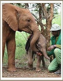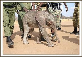 The David Sheldrick Wildlife Trust Rescue team, armed with all the usual paraphernalia, and the milk, left Wilson airport at 2.30 p.m. and after a one hour flight landed at the Airfield where the one week old infant elephant awaited them, standing trustingly beside his Samburu Rescuers and the Rangers. Having been fed Electrolytes to counteract dehydration followed by some formula milk, and given its first prophylactic antibiotic injection, the baby elephant was strapped onto the Rescue mattress, loaded onto the plane and flown to Nairobi, arriving at the Nursery in the late evening. It was a baby girl, and has been named Wasin after the nearby massif known locally as Ol Donyo Wasin, Wasin being the local term for the trees that are found growing on the summit. She arrive a bit wobbly, and with an umbilicus that needed some attention, the little elephant was still strong, taking her milk, and so far is doing well.