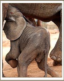 Mulika had been seen as usual with Yatta’s Ex Orphan group during the morning of the 6th November, but when Dame Daphne Sheldrick arrived at the Ithumba Orphans’ mudbath with guests during the mudbath hour that day, whilst Yatta and some of her group were there awaiting the arrival of the Youngsters, Mulika was no longer with them. Daphne and her guests were again at the Orphans’ mudbath at 11.30 a.m. on the 7th November, awaiting the arrival of the Keeper Dependent orphans as the Trust’s Water Bowzer was filling the drinking trough with fresh water, allowing what water the trough still held to drain into the mudbath itself. Suddenly, a large elephant appeared behind the Bowzer and the Keepers on the truck exclaimed “It is Mulika and with her is a baby!”. We all rushed round to take a look, and sure enough Mulika was with her newborn calf, which must have been born either during the night of the 6th or in the early hours of the 7th. It was minute, but perfect, reaching up on its hind legs to reach the milk bar and suckle every few minutes, and between whiles fitting snuggly beneath Mulika’s large frame. Mulika herself was perfectly calm and relaxed, and even brought her baby right up to Daphne and her guests who returned to sit on the concrete bench beside the mudbath. Meanwhile, in a state of high excitement, Head Keeper Benjamin took to his Suzuki vehicle to rush back and get the Trust’s Video camera to record this heart-warming event and to phone Trust Headquarters in Nairobi to pass on such joyful news to Angela and the Staff back at home.
