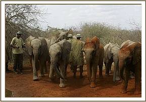 Learning about the electrically fenced Night Stockade Compound is always an off-putting experience for newcomers, and on this occasion poor Ndomot found himself “zapped” first on the head, and then the Bottom! The babies were then steered into the adjoining compartment of the electrically fenced Stockade together with Yatta and Olmalo, and there Olmalo took a shine to Galana, each elephant investigating the tiny tusks of the other, both being of a like size. Later Yatta made it obvious that she would rather move back to her usual place amongst the established Ithumba set, so her place was taken by Nasalot who took on this responsibility happily. Nasalot, Mulika and Wendi were immediately very loving to the little ones, whilst Yatta remained a little distant, probably slightly jealous of the attention they had generated amongst her satellites, but by the next morning all were again one happy family, set to embark on their first sortie into the Big Wide World of Tsavo’s giant Northern Area.