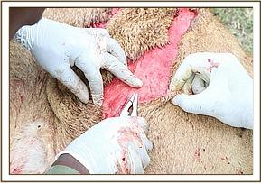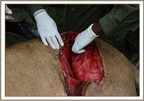 The wound was extensive and involved the soft tissues and the skin. The vet cleaned the wound using normal saline and then sutured it closed.