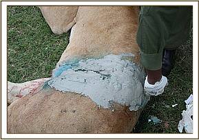 Finally, the vet applied Oxytetracycline spray and ointment. Green clay was also applied to the wound to accelerate healing. Long lasting antibiotics, Betamox and dexamethasone, were administered through intramuscular injection to prevent against infection.