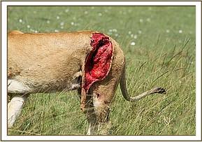 This lioness, who is a dominant member of the Marsh pride, was born within the marsh environs and had recently given birth to three cubs. She was found to have a dangerously deep wound but luckily without perforations to the stomach wall or any bone dislocation.