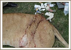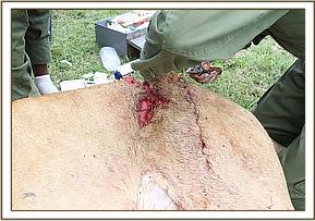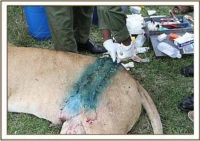 This lioness, who is a dominant member of the Marsh pride, was born within the marsh environs and had recently given birth to three cubs. She was found to have a dangerously deep wound but luckily without perforations to the stomach wall or any bone dislocation.