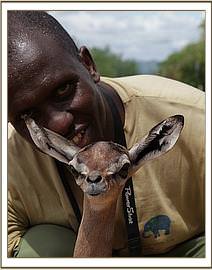 At Kaluku, our field headquarters that abuts the National Park in Tsavo, we have Nuk, a Gerenuk rescued by KWS from the Manyani Ranger Training Academy. Nuk is now nearly full grown, and living a totally free and wild life, but he still chooses to return and visit those who raised him at Kaluku from time to time, sometimes with absences of a few months. Little Cassie a female Lesser Kudu, a friend and companion of Nuk's, transcends both worlds, as does a bush buck orphan called Nyika.