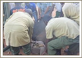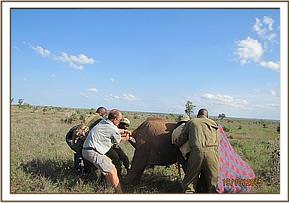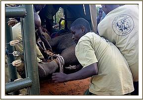All attention now focussed on rescuing her still milk dependent calf and the Voi Keepers and Anti-Poaching Team, together with DSWT Field Manager Trevor Jennings were called to assist. Once the teams arrived they were able to capture the female calf without anesthetisation and she was loaded into the waiting Landcruiser and driven slowly back through the Park to the Voi stockades where she was placed in a taming stockade.