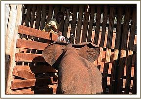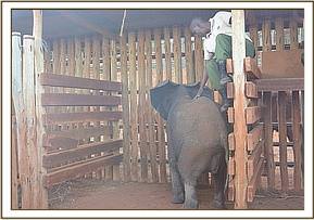 The presence of the other orphans had a calming effect on the newcomer and she instantly took milk from a bucket. It was a couple of days before she was sufficiently tame to take milk from a hand held bottle but once this had been accomplished she settled rapidly. We gave her the name ‘Araba’ meaning Elephant in the Waliangulu tribal language and estimated her age on arrival to be just under two years old, still very much a milk dependent candidate.