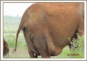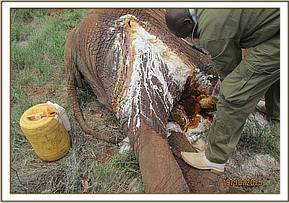 A seriously injured and ill elephant was brought to the attention of the DSWT/KWS Tsavo Mobile Veterinary Unit on the 19th of October, seen on the plains between Ndara and Dakota Tsavo East National Park. Remaining by her side was her small calf. The cow had multiple horrific arrow injuries, and due to septicaemia the prognosis regarding her recovery has very guarded. She was immobilised for treatment and meanwhile the calf remained nearby. When revived she was too weak to be able to stand, despite being helped with straps around her tusks, and she slipped away before everyone’s eyes.