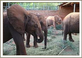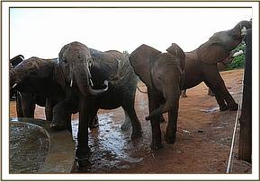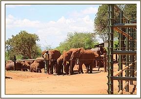 The Truck finally climbed the incline leading to the Voi stockades at 11 a.m. and all the Voi dependent orphans were there waiting, fully aware that an ‘event’ was unfolding on this day. Lesanju and Wasessa were the first to approach the fence separating the mud wallow from the loading bay, raising their trunks in anticipation, as they knew that more babies were arriving into their fold. Their excitement was clearly evident.