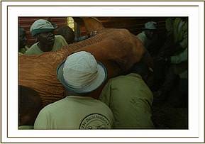 This particular move of six of our Nursery Elephants has entailed a great deal of heart-searching and planning, being more complex than usual, since the decision had been taken that the time had come to split the Voi group. The installation of all the infrastructure required for the new Elephant Re-integration Facility at Ithumba in the Northern Area of Tsavo East National Park presented a daunting challenge, not least financially, but also due to the remoteness of the area, as well as communication and water constraints. An electrically fenced Stockade was already in place for Imenti’s use, but we had to build Staff Lines, Storage facilities for milk and drugs, Water Catchment Tanks to trap precious rainwater, drinking troughs etc., etc. as well as electrically fence the Northern boundary of the Park. At the eleventh hour the purchase of a 4.5 million K. Shs. motorized Tanker became essential in order to cart fresh water to dilute the salinity of the existing ground water in that part of the Park since earlier rains had failed to fill the tanks. We were nervous of exposing our precious Nursery inmates to water of such high salinity without allowing them to become accustomed to it over a period of time. By the June 18th - the deadline for the move - everything was in place, as well as the BBC Natural History Section to film the event for their proposed “Elephant Diaries” series. Luckily it happened that Imenti was also on a long walkabout having at last befriended the wild elephants, which was a relief, since his presence could cause something of a disruption at both an elephant and human level! The six Nursery inmates to be moved were Wendi ex Imenti Forest, (now aged 21 months and the mini-Matriarch of the Nursery), who came to us the day she was born, and like Imenti, was saved from certain death by an infusion of blood plasma taken from “Thoma” due to her latent immune system deprived of the mother’s first Colostrum milk; 2 year old Napasha (ex Mpala Ranch, Laikipia), OlMalo (aged 18 months, ex Loisaba Ranch Laikipia), Taita (aged 16 months, the cess-pit casualty, ex Taita Hills Hilton Sanctuary); and Selengai (aged 15 months also from Loisaba Ranch). The decision to move the six Nursery Elephants directly to the North had not been taken lightly and entailed a great deal of discussion between ourselves, (including Jill), and the Voi Keepers. Emily’s group, consisting of 31 still dependent elephants, had become unwieldy for the Keepers to manage during Tsavo’s long dry seasons, something that was highlighted during the last long dry season of 2003 when the October rains did not arrive until January 2004, and we were faced with possibility of having to walk the entire herd to better pastures. Which elephants to move was another matter of deep discussion, not taken lightly either, for this posed a new and huge challenge. Finally, it was decided that four of the younger females should be targeted for the North to provide the Matriarchal component for the Nursery babies, yet small enough not to rouse the mating aspirations of Imenti if and when he returned, as he was bound to do. Once these young females had settled in and adapted to their new charges and surroundings, we propose to walk some of the bulls of a similar age up to join them, allowing the females advantage over the bulls. Eventually it was decided that those to be moved would be from the four to five year old age set, namely Mulika (ex Meru Park) and Nasalot (ex Turkana), firm friends from their Nursery days; Kinna (ex Meru Park) and Yatta (ex Tsavo Triangle area) – also firm friends who had been together in the Nursery. It was felt that taking older ones from Emily and Aitong would cause a major upset and possibly dissention between Emily and Aitong, should Emily choose to replace her missing “favourites” by taking some from amongst Aitong’s special calves. Also the friendship between the four chosen youngsters was long-lasting and binding. They were sufficient unto themselves and had not yet made lasting friendships with the wild community, something the older elephants had already achieved. As usual, at the Nursery, the large Safari trucks that would be used for the move were in place for several days beforehand, backed up against the loading ramps so that the Nursery elephants could undergo loading practice by being fed their milk inside the open back. As usual, those orphaned old enough to clearly remember the trauma of a journey in a vehicle were the reluctant ones, namely Napasha and Taita.