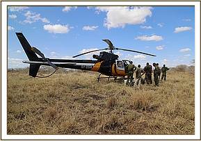Two months later she was sighted again by the teams on the ground who had finally found her within a herd of 70 elephants still with the snare attached to her trunk. The Sky Vet Unit was immediately mobilised from Nairobi with KWS Veterinary Officer Dr Fred Olian’ga flying to the site in a helicopter on the afternoon of the 16th.