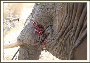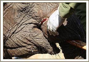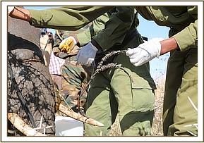The veterinary team found the young female with the snare cutting into the flesh around the base of the trunk in close proximity to the mouth. It was noted that she was in good body condition and the snare had not cut too deeply through the soft tissue of the trunk.