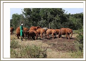 Meanwhile, Pea obviously felt totally “at home” amongst the orphaned elephants, allowing them to suckle her thighs, lying down in the soft earth pile with them when they enjoyed dusting their wet bodies after the mudbath. She would fan her wings and by so doing cause a soft dust cloud to envelop everyone. At times when the elephants took a nap, she would lie next to them, cradling them with her neck and covering them with her soft feathers. She truly believed she was part of their herd, and since birds are known to imprint, she believed she was an elephant and behaved as such amongst them, during the open visiting hour between 11am and 12 noon, parading around the visiting public standing behind a cordon and never pecking them or attempting to peck any shiny ornament they happened to be wearing. With the absence of Pod, peace and order reigned again for the keepers who can now wear their raincoats again on rainy days!